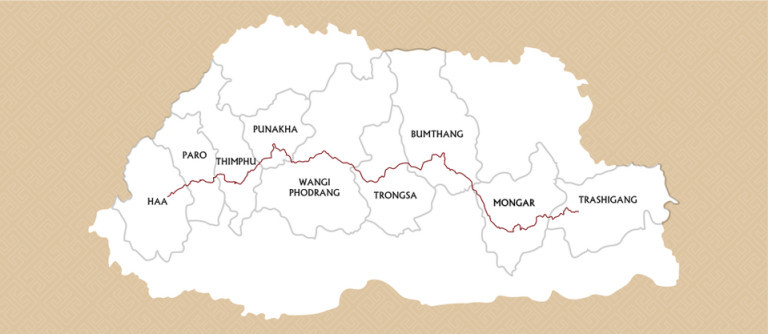 Трансбутанската пътека обхваща 430 км от изток на запад от тази дребна, само че необикновено красива страна без изход на море, ситуирана надълбоко в дебрите на източните Хималаи, сред Китай и Индия.