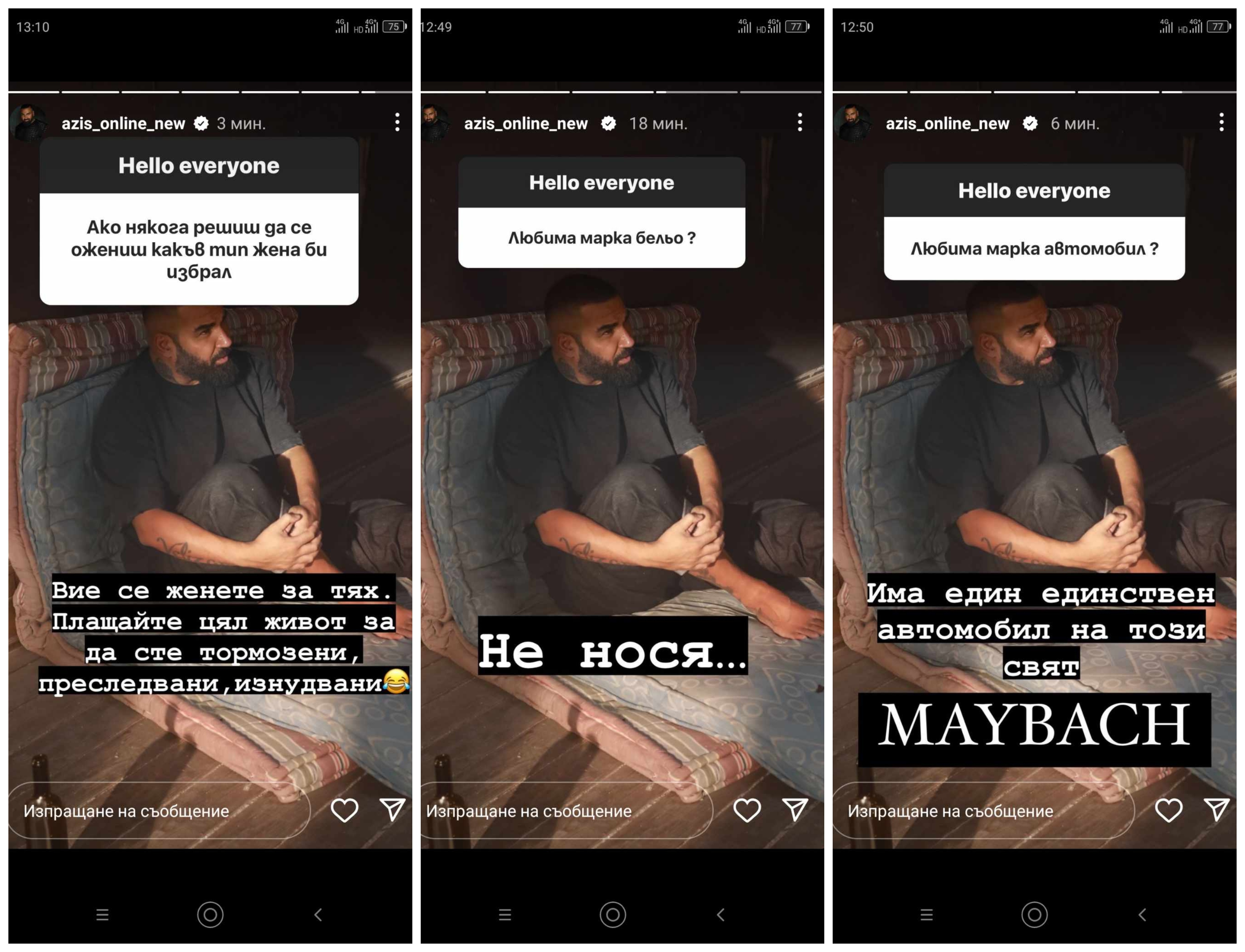 Очевидно по-късно Краля на попфолка е решил да не употребява към този момент долни дрехи. На питанка от почитател за татуса му на ръката за кого е отдаден, Азис дава отговор шеговито, че е за " Пешо магазинера от Казичене ".