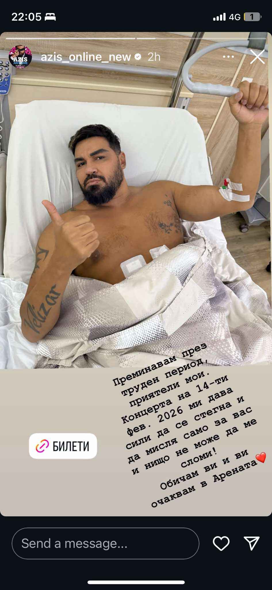 Краля на попфолка Азис влезе в болница. Костинбродския славей разгласи, че го закъсал със здравето в обществените мрежи като пусна фотография от болничното легло на системи. Към поста Азис написа, че минава през сложен интервал. " Концертът на 14 февруари ми дава мощ да се стегна и да мисля единствено за вас и нищо не може да ме пречупи ", написа той.