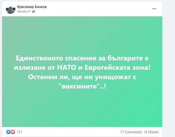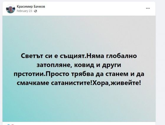 Красимир Бачков, създателят на, се оказа поборник против НАТО, " Еврогейския съюз ", " Сатаната Съединени американски щати! ", " хранениците на Сорос ", както и покровител на партия " Възраждание ". Това излиза наяве от пламенни изявления на самия Бачков във Facebook профила му.