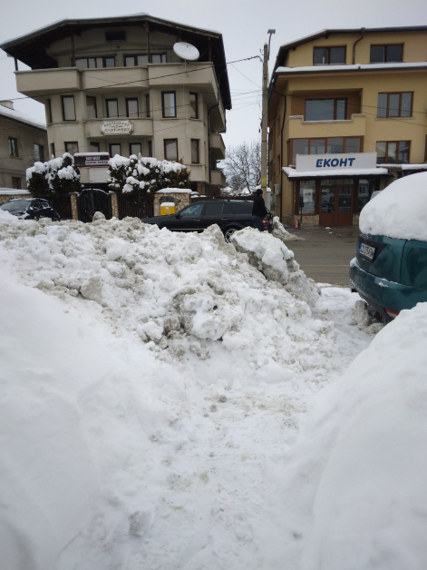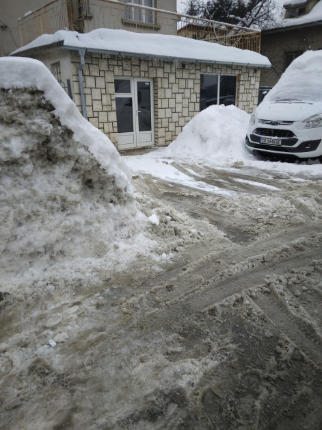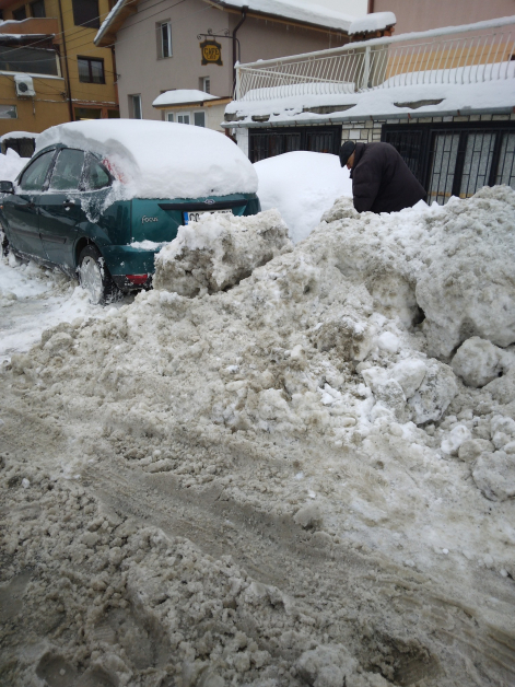 " Ние – хората, живеещи на ул. " Македония ", бедстваме! Днес към 12:00 часа лице с екскаватор, с цел да се нахрани в ресторант " Изток Запад ", си разчисти място за паркиране, като реалокира купища сняг и лед пред нашата къща и изцяло ни затвори изхода, който сами сме си проправили! ", написа Милтенова.