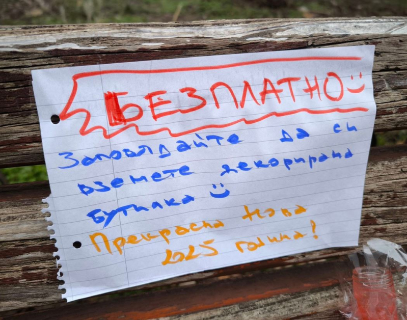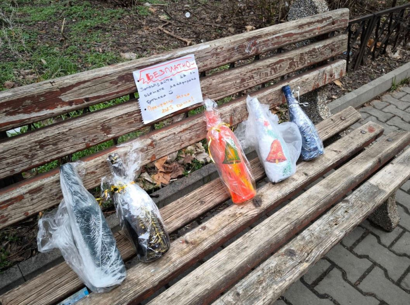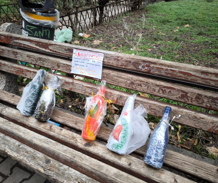 Красив жест зарадва столичани, часове преди да посрещнем Нова година. На скамейка на улица в София са сложени няколко красиви декорирани бутилки. Те искрят с ярки цветове в мъгливия ден, а над тях виждаме и залепена записка. " Безплатно! Заповядайте да си вземете декорирана бутилка. Прекрасна Нова 2025 година ", четем на листчето хартия, изписано с ярки цветове. Чия е тази радостна самодейност - информация няма, а публичност за нея дава Владимир Христовски в " Безумията в София ". Той споделя и фотоси, на които се виждат пъстрите шишета, деликатно сложени на пейката на улица " Краище ". Нека изпратим 2024 година с вяра, че през 2025 година в света край нас добрината ще доминира, за сметка на вестите за експанзия, несгоди и проблеми.
