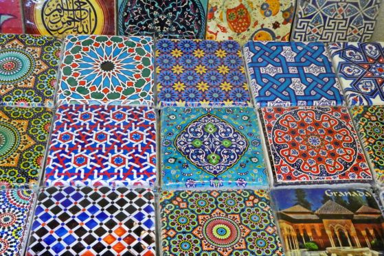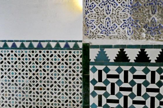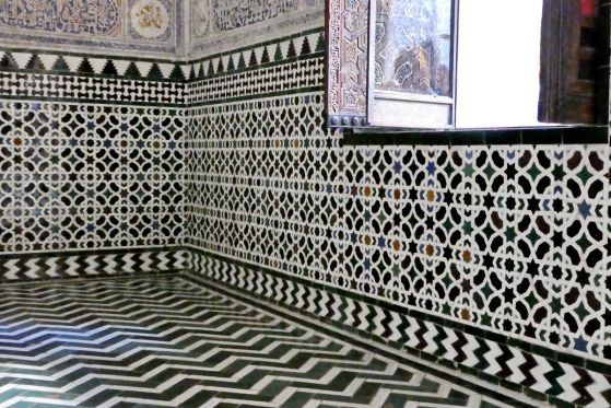 Плочките са едноцветни, нарязани в разнообразни геометрични форми и аранжирани в безкрайни по мярка и многообразие панели върху стените и пода. Интериорът просто засмуква със своята линейна, някак математически нереална хармония. Облицовките на стените са като че ли образни модели на функционалности, прогресии и тези цифри на Фибоначи, които той открива по същото това време при пътуванията си на Изток. Ислямът не позволява човешка ръка да пресъздава сътвореното от Всевишния, по тази причина отсъстват всевъзможни реалистични изображения и картини. Пиршеството за сетивата на тогавашните емири (и моя благосклонност днес) е плод само на невероятната фикция при играта с геометрични фигури и комбинирането на цветове.