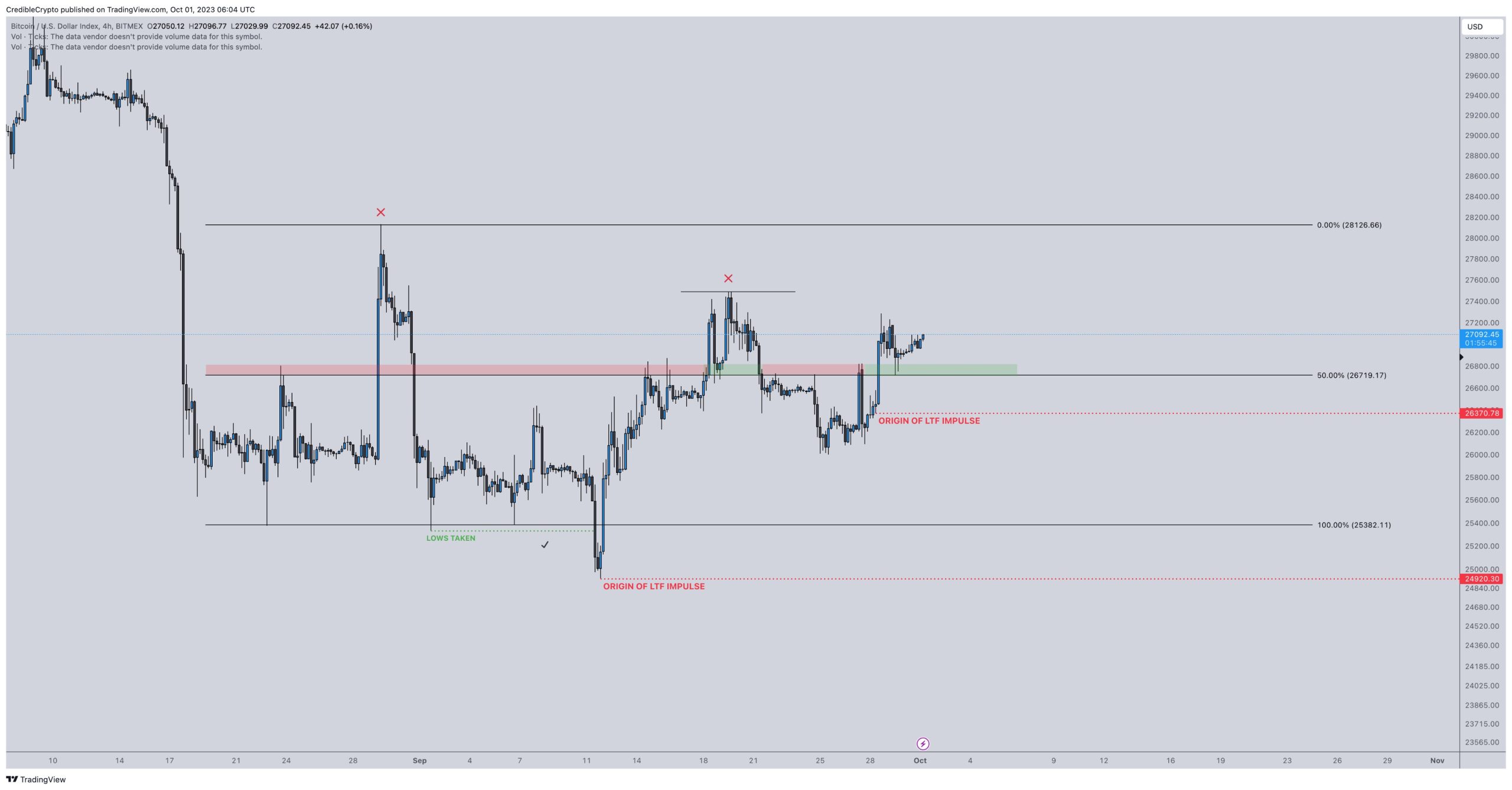 Според Credible, в случай че Биткойн в действителност се намира в ранните стадии на доста възходящо придвижване, то той не би трябвало да падне под $26,370, откъдето произлиза импулсът на ниската времева рамка: