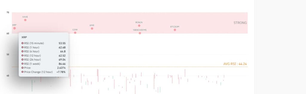 Kъм момента на писане на публикацията XRP се търгува на цена от $2.55, което съставлява растеж от 2% за последните 24 часа, дължащ се на възходящия покупателен напън. Нейният 24-часов RSI от 69.04 алармира за мощен подтик, само че се приближава до зоната на свръхпокупките, до момента в който седмичният RSI от 86.66 приканва за нерешителност на по-високите времеви рамки.