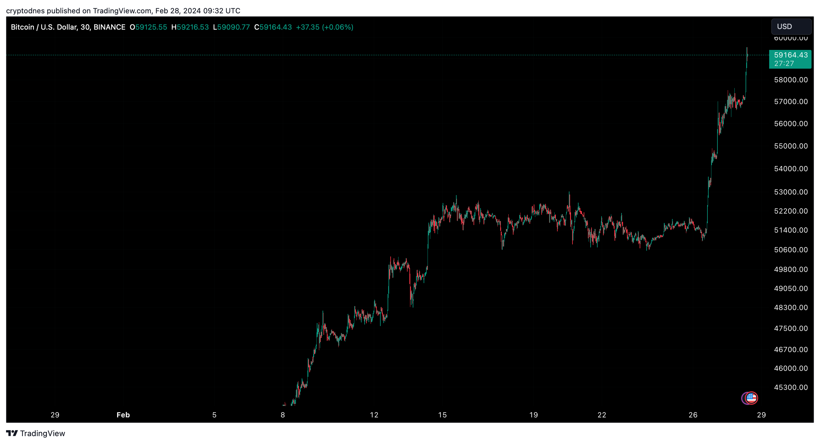Към момента на писане на публикацията Биткойн се търгува към $59,160 с на ден нарастване на цента от 5%, приближавайки се до заветнoто равнище при $60,000.