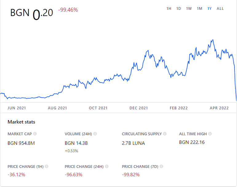 Цената на стейбълкойна TerraUSD остава занижена до 0,56 $, а свързаната криптовалута LUNA изтра съвсем цялата си цена със спад от над 99% към 13 часа българско време, по данни на coinbase.