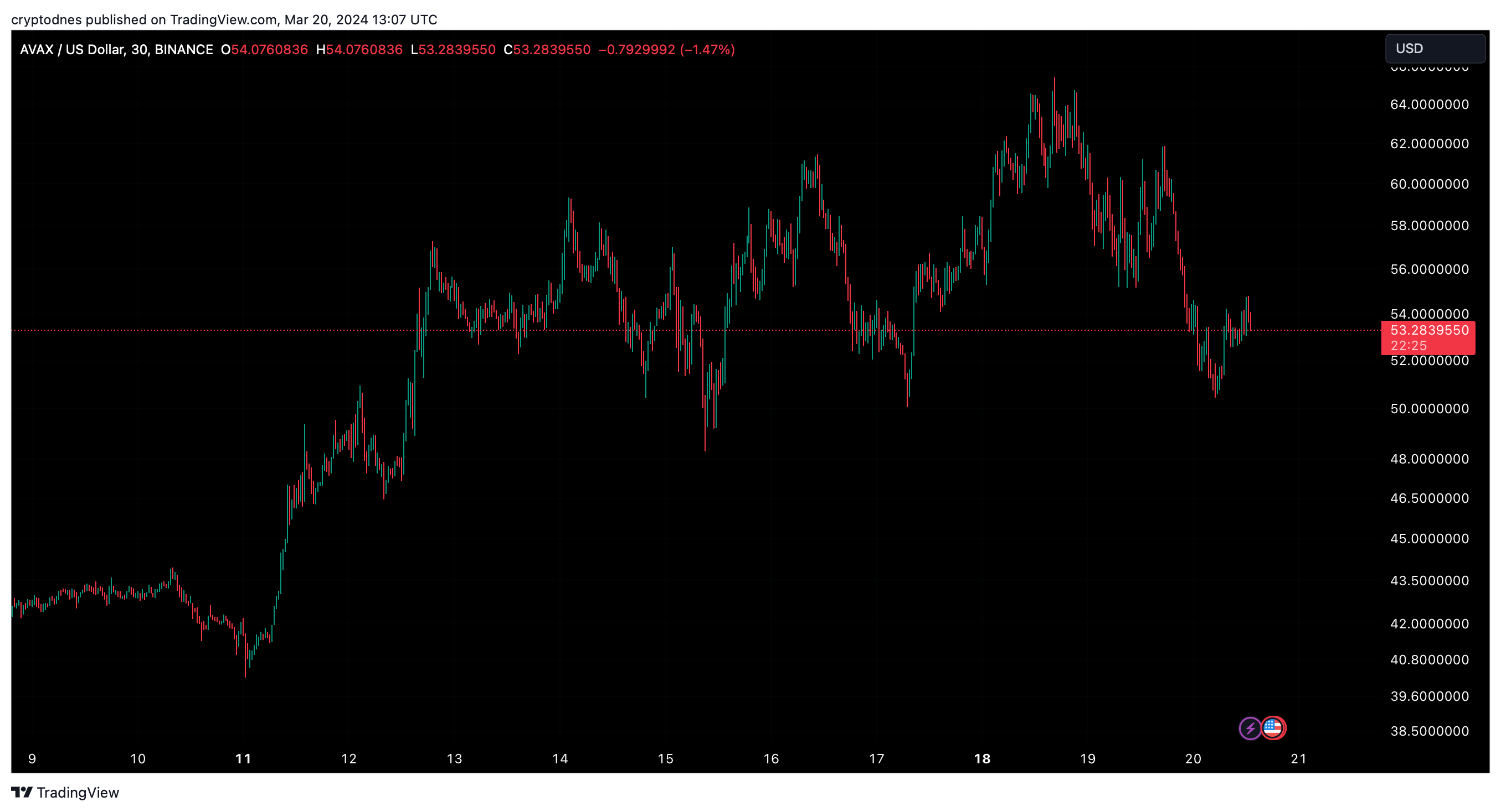 Криптовалутата Avalanche (AVAX) претърпя удивително оттегляне през последните 24 часа, като се намали от $65.3 до $53, отбелязвайки спад от 10%.