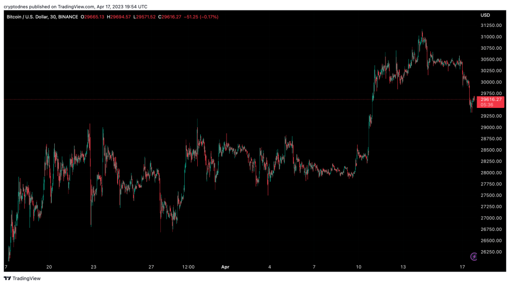 Цената на Биткойн се намали с към 3% през последните 24 часа, спадайки до към $29,500 все още на писане на публикацията, съгласно данни на TradingView. Това се случи откакто актива мина сериозното равнище от $30,000 през предходната седмица, за първи път от юни 2022 година насам.
