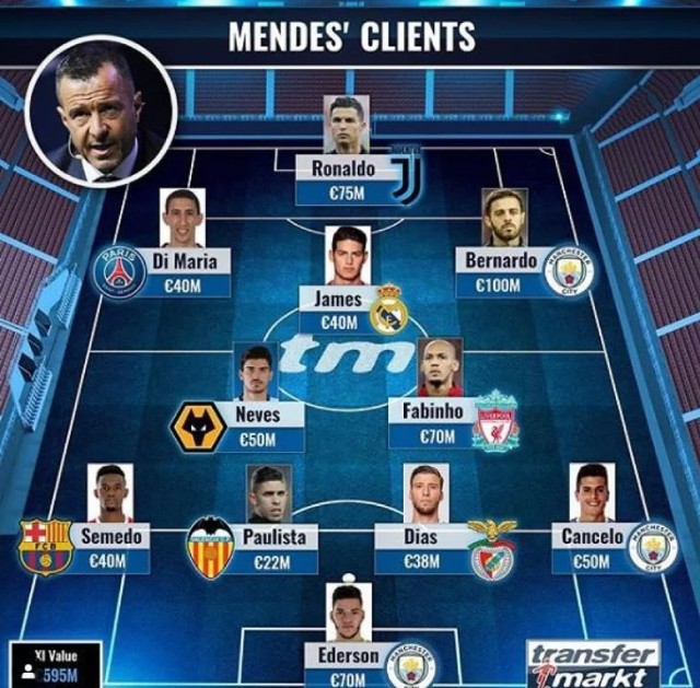 Преди две години Transfermarkt разгласява графика с най-скъпата единайсеторка от клиенти на суперагента Жорже Мендеш. Въпреки че е безспорно най-именитият в състава, Роналдо не е най-скъпият. Оценяват го на 75 млн. евро, до момента в който Бернардо Силва от " Манчестър Сити " - на 100.
