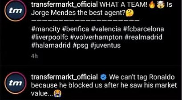 Защо Роналдо се разсърдил и блокирал Transfermarkt в "Инстаграм"?