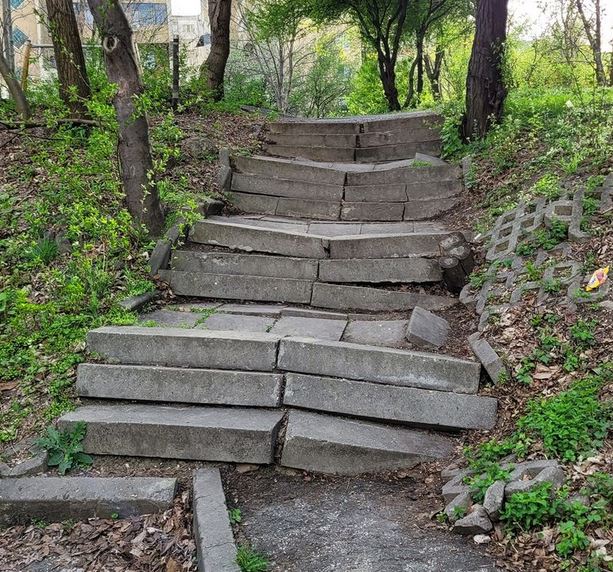 Но наподобява пешеходците не са във въздорг от положението му. Част от стъпалата са криви и пропаднали, като приключват в бордюр, а изкочили плочи заплашват невнимателните.