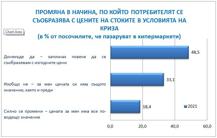 Само 33,1% споделят, че цената има същото значение за тях, както и преди. Тук е и една от най-сериозните разлики сред дамите и мъжете: при дамите делът на тези, които са почнали мощно да се въздействат от цените, е двойно по-голям от съответния дял при мъжете.