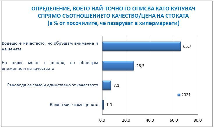 Водещата част от потребителите - 65,7%, залагат на качеството на стоките, само че обръщат внимание и на цената. За 26,3% имено цената е водещ фактор, само че обръщат внимание на качеството.