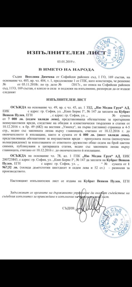 Съгласно решението на арбитър Веселина Димчева от Софийския областен съд от 3 януари Кубрат Пулев би трябвало да получи общо 14 967, 52 лв. обезщетение. 7000 от тях са за претърпени неимуществени вреди, разследване на обидни и оскърбителен изказвания в публикация от 10.12.2016 година в бр. 49 (682) на вестник „ Уикенд “ (на страница 1 и на 4-5 със заглавие „ Кубрат лапна Щатски долар 1 милион от цирка в „ Арена Армеец “). Останалите 6000 са за нанесени имуществени вреди – пропусната изгода (неполучено възнаграждение) за употребяваните от ответното сдружение общо седем на брой цветни фотоси, оповестени в цитираната публикация. Има и трета сума по делото, която би трябвало да бъде изплатена на Пулев – 1 967, 52, като това са разноските по производството.