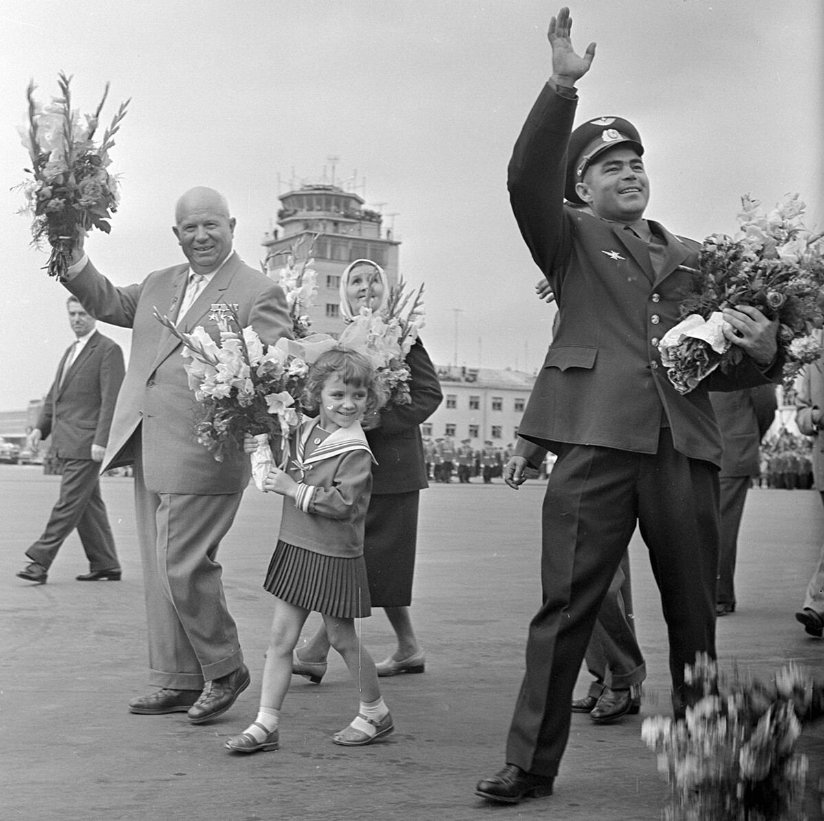 А долу е Хрушчов и космонавтът Андриян Николаев, които поздравяват московчани след сполучливия орбитален полет на галактическия транспортен съд „Восток-3“.