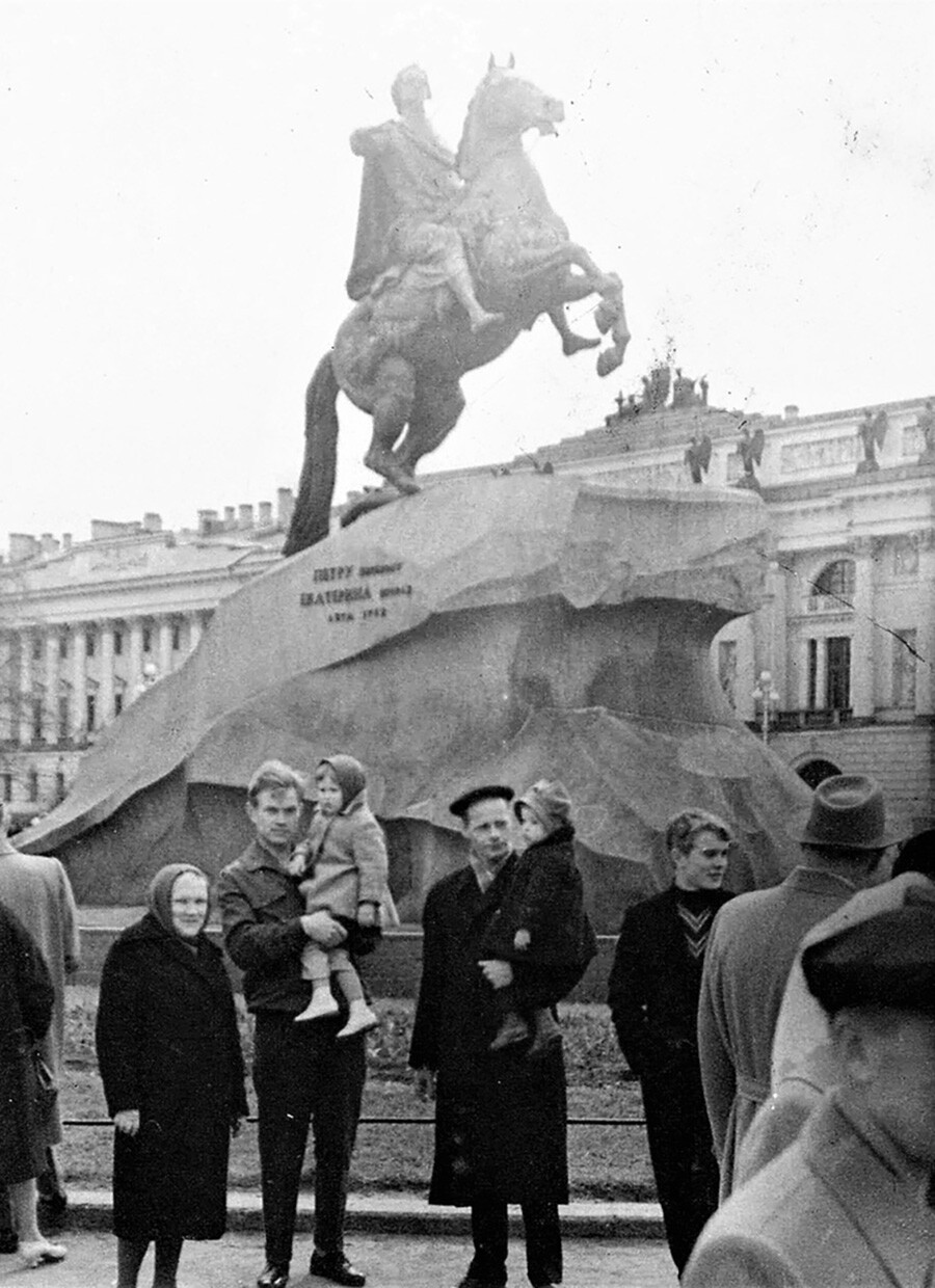 Юрий Абрамочкин/Архив на Юрий Абрамочкин Туристи в Ленинград, културната столица и главен туристически атракционен град, се снимат с паметника на Бронзовия конник на Петър Велики.