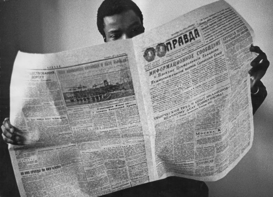 „Нашата истина“: Чуждестранен студент чете вестник „Правда“.