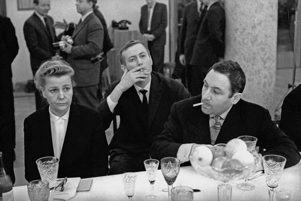 Сигизмунд Кропивницки/MAMM/MDF Поколението на 60-те години на ХХ век и културният взрив. На фотографията от ляво на дясно: министърът на културата Екатерина Фурцова, поетът Евгений Евтушенко, скулпторът Ернест Нейзвестний.