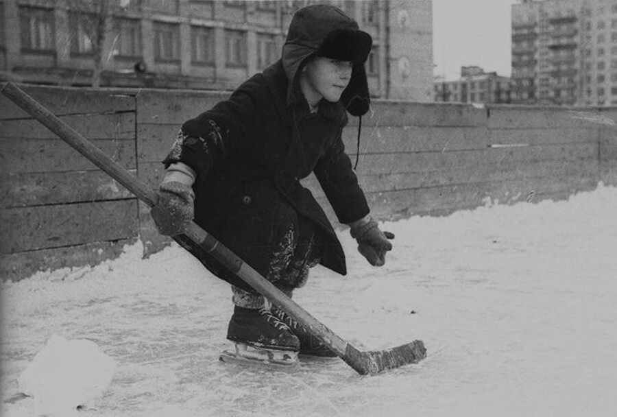 На вратата: деца играят хокей в Ленинград.