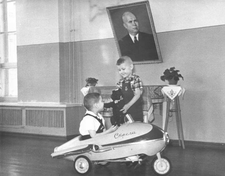 Играчка за първокласен автомобил в руска детска градина (на фотографията с портрет на Никита Хрушчов).