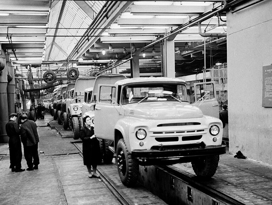 Камион „ЗиЛ“ на конвейера в автомобилния цех „Лихачов“ (през 1962 година заводът даже пуска в употреба състезателен автомобил!).