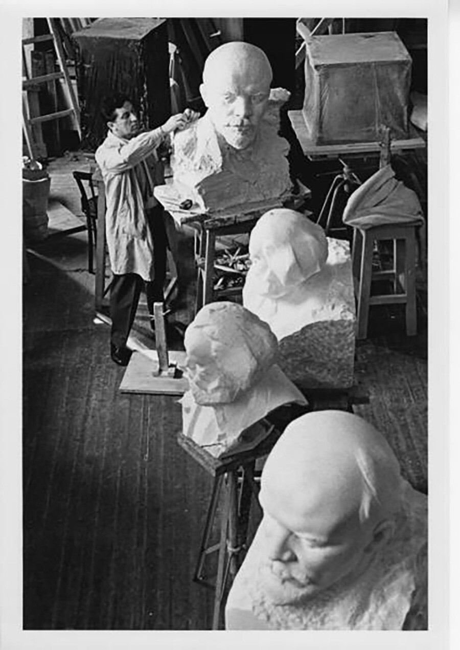 В ателието на скулптора Лев Кербел. Той е прочут на първо място с паметниците си на Владимир Ленин, както и на Карл Маркс и Юрий Гагарин.
