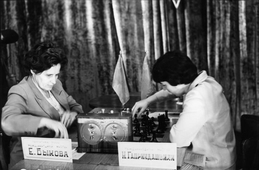 Една шахматна нация. Нона Гаприндашвили (вдясно), упомената в телевизионния сериал на Netflix „Гамбитът на кралицата“, се бори за международното състезание.