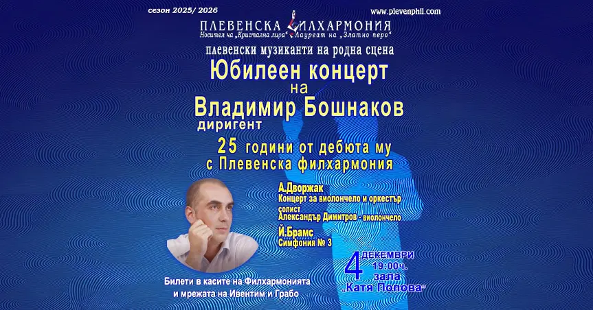 4 декември (четвъртък) - Плевенска филхармония кани на концерт от поредицата „ Плевенски музиканти на родна сцена “ - юбилеен концерт на маестро Владимир Бошнаков и 25 години от дебюта му с Плевенска филхармония. Солист: Александър Димитров – виолончело. В програмата: А. Дворжак - Концерт за виолончело и оркестър, Й. Брамс - Симфония № 3. Начало - 19.00 часа;