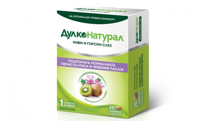 ДулкоНатурал с натурални екстракти от киви и горски слез. Понякога имаме потребност от профилирана помощ в регулирането на стомаха и битката със запека. ДулкоНатурал се грижи за комфорта и здравето на храносмилателната ни система и възвръща естествената перисталтика и чревен откъс. Продуктът съдържа 100% натурални екстракти от киви и горски слез и е подобаващ е за приложимост над 12-годишна възрасt. Приемът на продукта е извънредно улеснен – единствено по една таблетка на ден.
