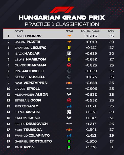 Съотборникът на монегаска Люис Хамилтън, който е най-успешният водач въобще в Унгария, се подреди пети, на 0.682 зад Норис. Пред седемкратния международен отличник съумя да се вмъкне и Исак Хаджар, който беше с 0.053 по-бърз от британеца. В топ 10 в края на първия час за подоготовка този уикенд попаднаха още Оливър Беарман, Андреа Кими Антонели, Джордж Ръсел, Макс Верстапен и Ланс Строл, който имаше нов съотборник в лицето на Фелипе Другович в границите на сесията.