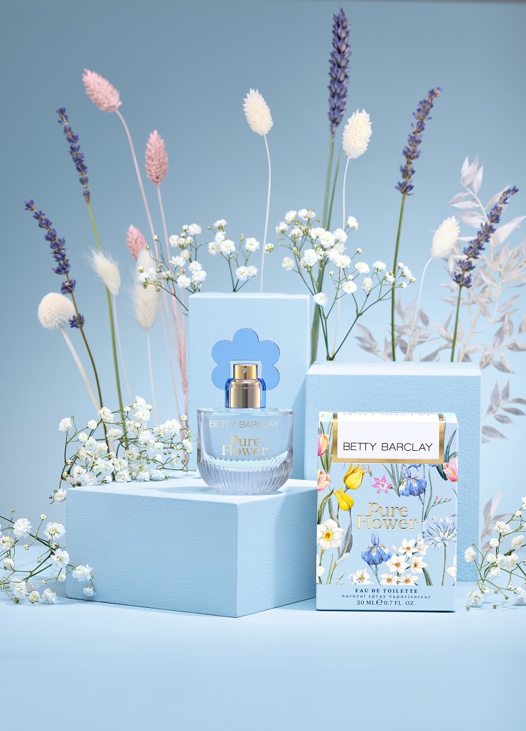 Betty Barclay Pure Flower черпи ентусиазъм от силата на дамите и акцентира техните същински характерности – хубост, упоритост и самонадеяност. Ароматът се отваря с бяла лавандула, свежи цветове на резеда и чисти алдехиди. В сърцевината му се крие съвременен букет от нежна роза, сетивен божур и топъл ветивер. Кремообразен мускус, изсъхнал кехлибар и кадифена ванилия приключват този дългогодишен, изтънчен и грациозен мирис.Визуалният дизайн на Betty Barclay Pure Flower също отразява неговата цветна същина. Флоралната илюстрация върху пастелно синята външна опаковка разсънва мемоари за лятото. Акцентът на транспарантната овална бутилка е капачката с формата на цвете, която интерпретира флоралната тематика по незабравим метод. Бутилката и външната опаковка са украсени със златисто, което им придава грациозен и мекушав тип. Източник: eva.bg