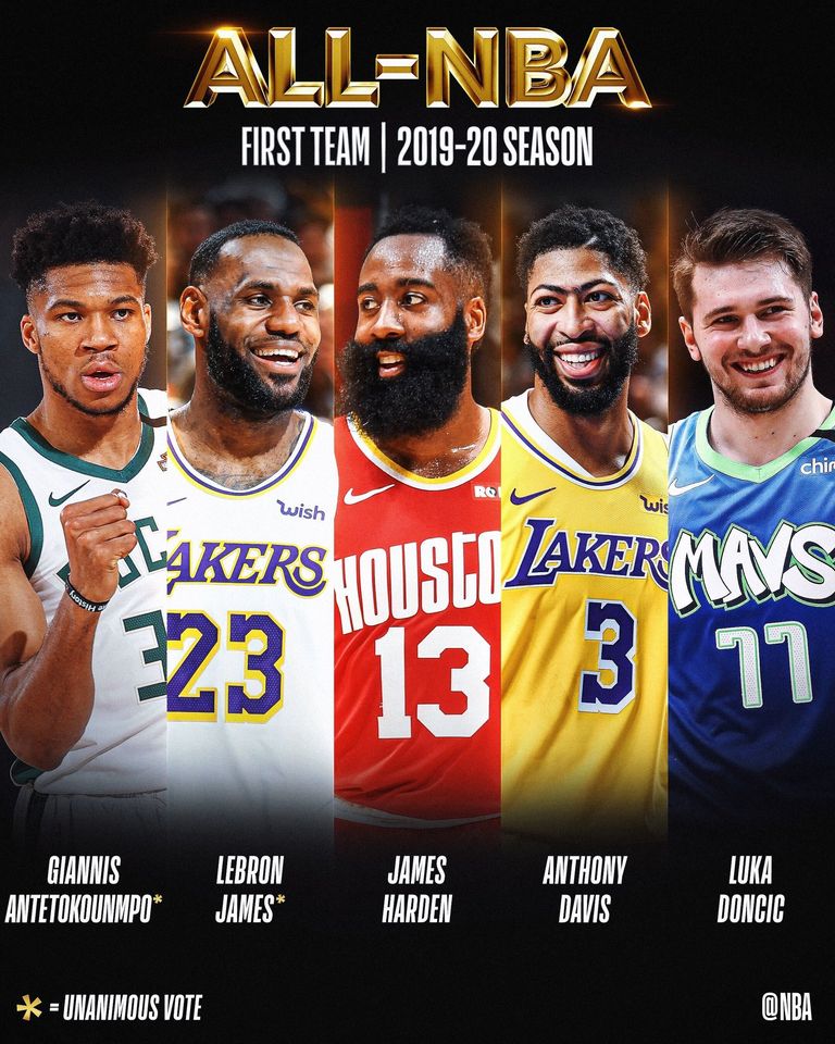 Компания на Леброн Джеймс в Идеалния тим на 2019/2020 вършат Янис Адетокунбо от Милуоки, Джеймс Хардън от Хюстън, Антъни Дейвис от Лейкърс и Лука Дончич от Далас.