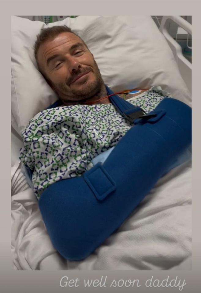 В петък сутринта, в трогателна обява в Instagram, 51-годишната му брачна половинка Виктория написа: „ Оздравявай бързо, баща “ . На фотографията 50-годишният Дейвид театралничи с усмивка и със синя превръзка на ръката, само че все още няма информация по какъв начин е получил контузията.