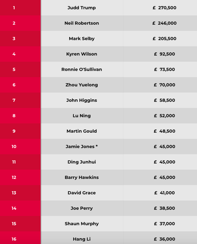 С чека си от 70 000 паунда пък Селби остава на трето място в тази ранглиста, изоставайки само от Джъд Тръмп и Нийл Робъртсън. Голям напредък записва полуфиналистът “в Шотландия” Джейми Джоунс - от 24-а до 10-а позиция, а Ли Хан се изстреля от 53-а на 16-а.