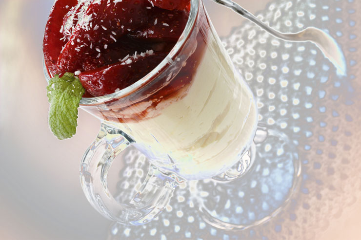 Разбих белтъците с останалата захар, до твърди върхове. Добавих ги на части към лимоновия крем. Разбих сметаната с ванилия и също прибавих деликатно.Приготвих ягодите няколко часа преди поднасянето, с цел да пуснат сок - нарязах ги и подправих със захар и ликьор. Охладих добре и сервирах с кокосови стърготини.