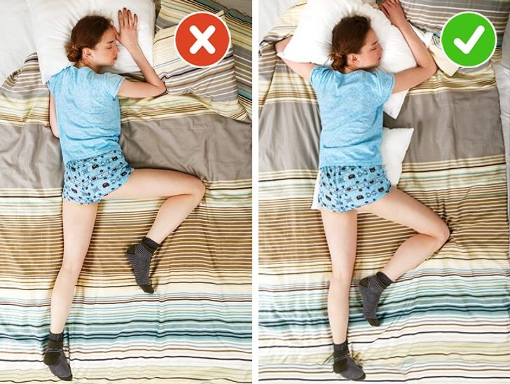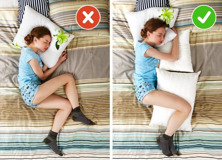 За да държите гърба изправен, когато спите на една страна, поставете твърда и дребна възглавница сред краката си: това ще понижи натиска върху ставите. Поставете мека и огромна възглавница под главата си.