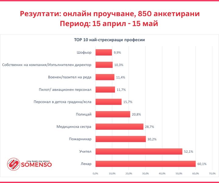 Лекарската специалност е най-стресираща у нас. Това сподели онлайн изследване на компанията Somenso, извършено измежду 850 респонденти от разнообразни професионални среди в интервала 15 април – 15 май. Над 60% от участниците са показали лекарите като най-стресирани измежду 31 други професионални посоки, а медицинските сестри са посочени от близо 29% от интервюираните. Медиците са следвани от учителите (52%) и пожарникарите (30%).