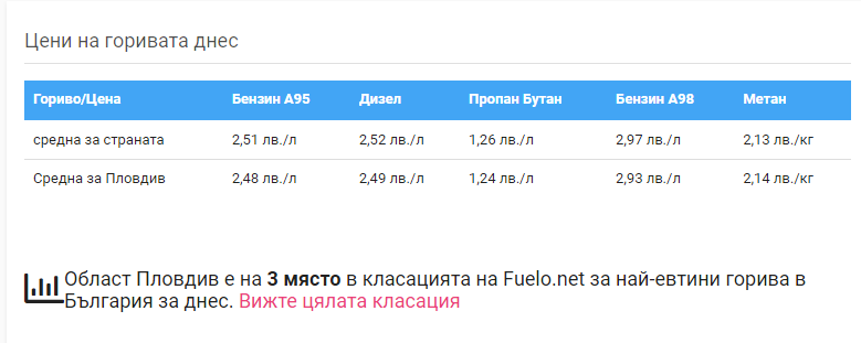 Като цяло цените на горивата в България през ноември 2024 година демонстрират относителна непоклатимост, по отношение на последните няколко месеца. В Пловдив междинната цена за бензин А95 е към 2,48 лева./л, дизелът се продава за 2,49 лева./л, а газта коства към 1,24 лева./л. Метанът се търгува за 2,14 лева./кг. Тези цени нареждат областта на трето място в страната в самобитната ранглиста за най-евтини горива. На първо място е област Ямбол, следвани от София. Най-скъпите горива се оферират в Разград, следвани от областите Кърджали, Смолян и Плевен.