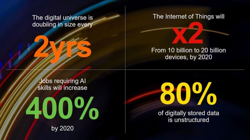 Дигитализацията се усилва двойно на всеки две години. Т.нар. Интернет на нещата или интернет на движимостите, който.... също ще удвои своето приложение и до 2020 година устройствата, които ще бъдат ръководени по този метод ще скочат от сегашните 10 милиарда на 20 милиарда Нуждата от експерти, които има умения в областта на изкуствения разсъдък ще нарасне с 400% също до 2020 година А 80% от цифрово съхранената информация е неструктурирана...