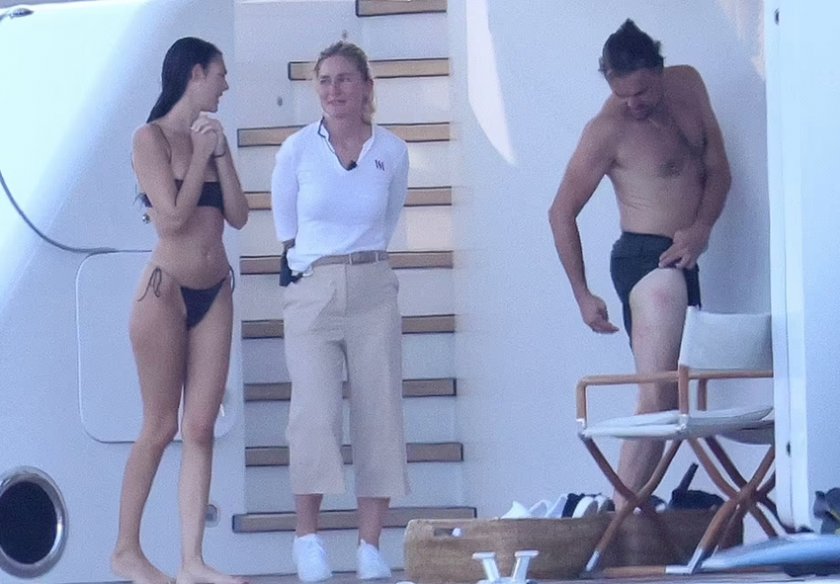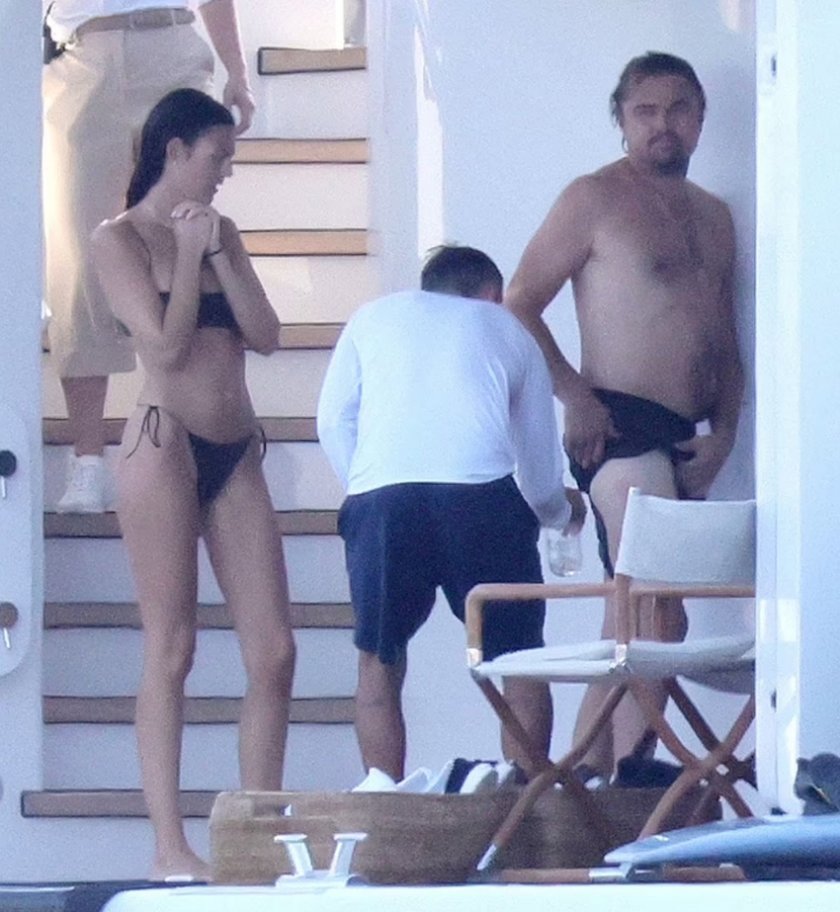 На фотосите се вижда по какъв начин Ди Каприо се пробва да прегледа алена диря откъм гърба на дясното си бедро на палубата на лодката, дръпвайки банския си встрани, с цел да види мястото. Черети и един от членовете на екипажа на яхтата пък асистират на кино звездата.