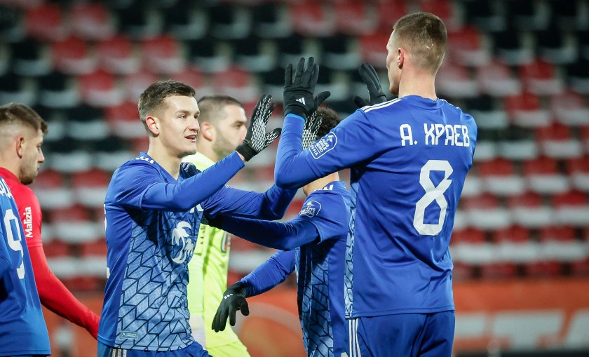 Единственият гол в първото полувреме падна в идната офанзива на " сините " в 27-та минута. Българският национал Марин Петков овладя топката отляво и влезе с нея на дрибъл в наказателното поле, след което я изпрати в далечния ъгъл за 1:0 за Левски.