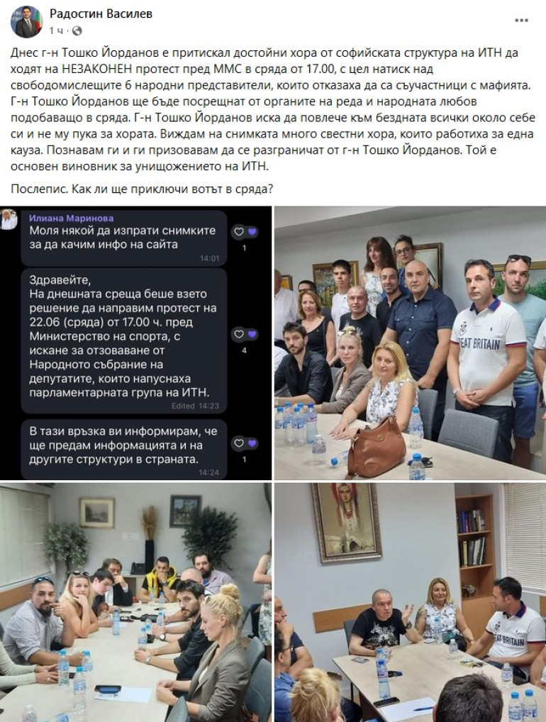 „ Днес господин Тошко Йорданов е притискал почтени хора от софийската конструкция на Има Такъв Народ да вървят на НЕЗАКОНЕН митинг пред ММС в сряда от 17.00, за напън над свободомислещите 6 народни представители, които отхвърлиха да са съучастници с мафията. Г-н Тошко Йорданов ще бъде посрещнат от органите на реда и националната обич уместно в сряда. Г-н Тошко Йорданов желае да повлече към бездната всички към себе си и не му пука за хората. Виждам на фотографията доста свестни хора, които работиха за една идея. Познавам ги и ги приканвам да се разграничат от господин Тошко Йорданов. Той е главен провинен за заличаването на Има Такъв Народ.