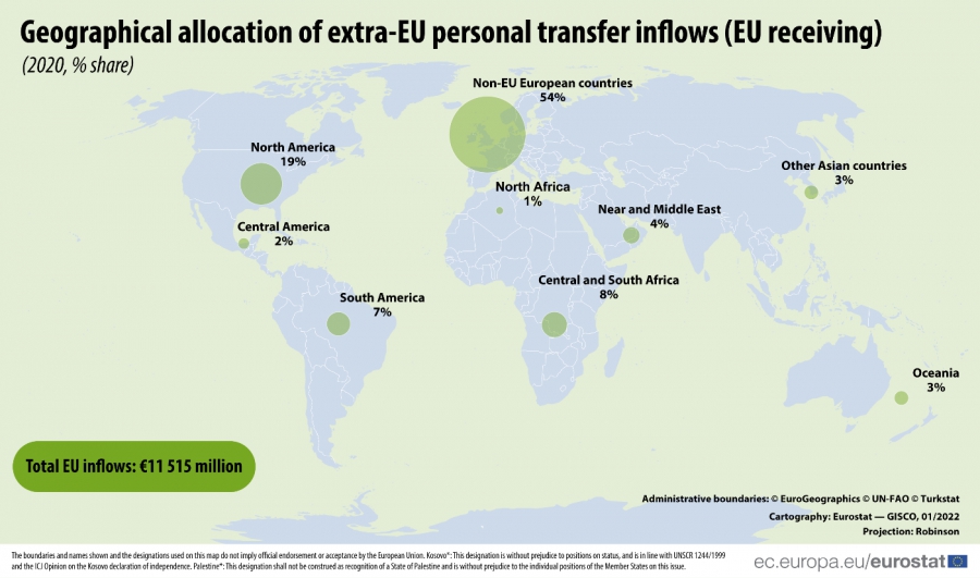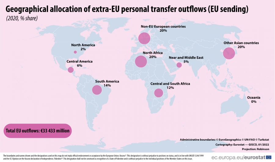 Личните парични прехвърляния на поданици на Европейския съюз към жители на страни отвън Европейски Съюз възлизат на общо 33.4 милиарда евро през 2020 година, сочат данните на Евростат. Голяма част от тези прехвърляния съставляват пари, пратени от мигранти към техните родни страни, прецизират от европейската статистическа работа.