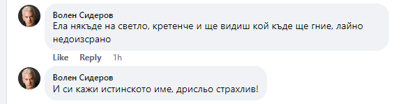 " Исак Паси. Помияр замърсен. Ако Хитлер беше спечелил войната в този момент нямаше да мърсиш фейсбук със зловонната си уста. Моли се на Господ единствено да не те срещна на улицата!!! ". А заканата на Волен по никакъв начин не се разграничава от тази в частта си да сгащи Паси на открито и да го научи.