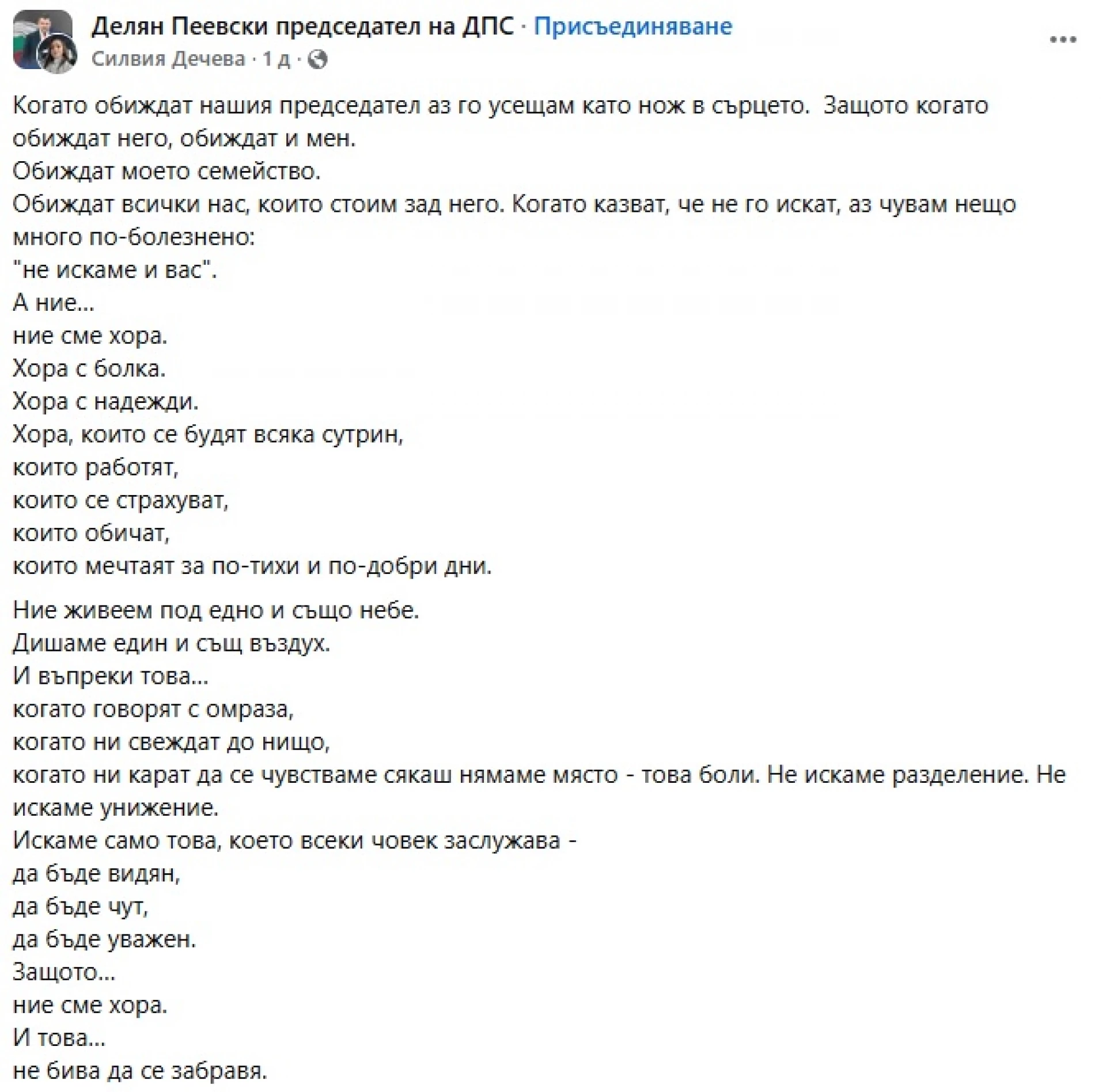 „ Когато приказват с ненавист, когато ни свеждат до нищо, когато ни карат да се усещаме като че ли нямаме място – това боли. Не желаеме разделяне. Не желаеме оскърбление “, написа тъжно Дечева.