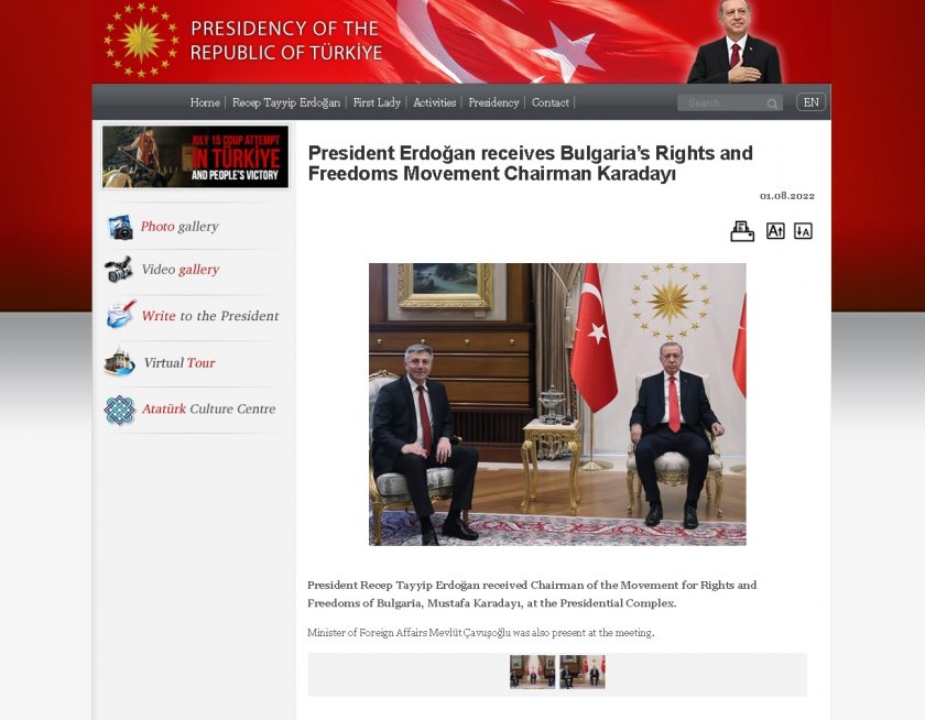 Лидерът на Движението за права и свободи Мустафа Карадайъ се е срещнал с турския президент Реджеп Тайип Ердоган. Закритата за публицисти намира се провела в президентския замък в столицата Анкара. На срещата е участвал и министърът на външните работи Мевлют Чавушоглу. Това заяви пресслужбата на Ердоган.