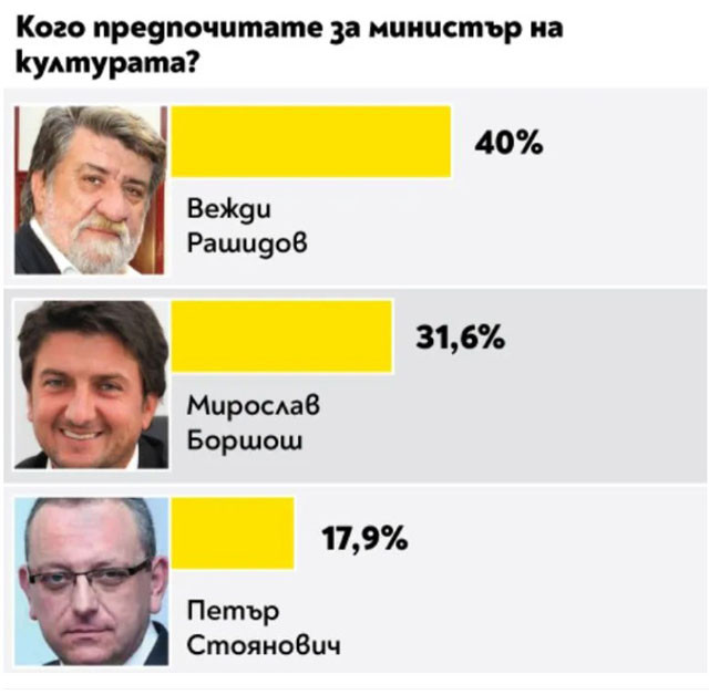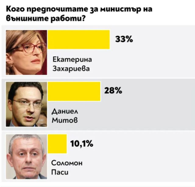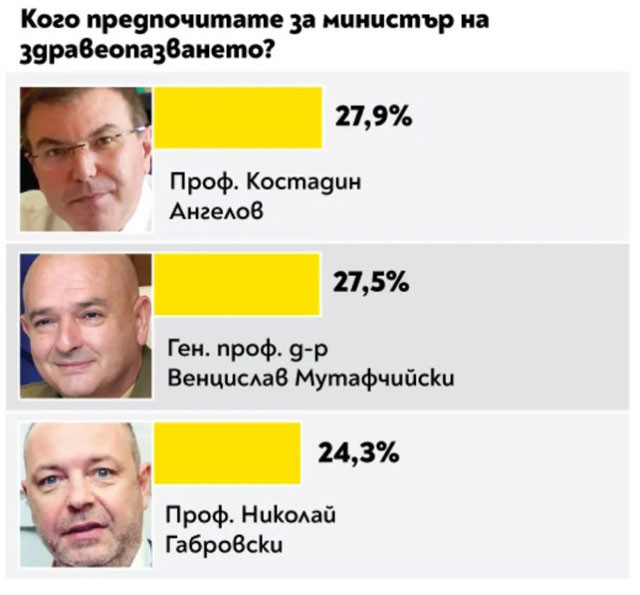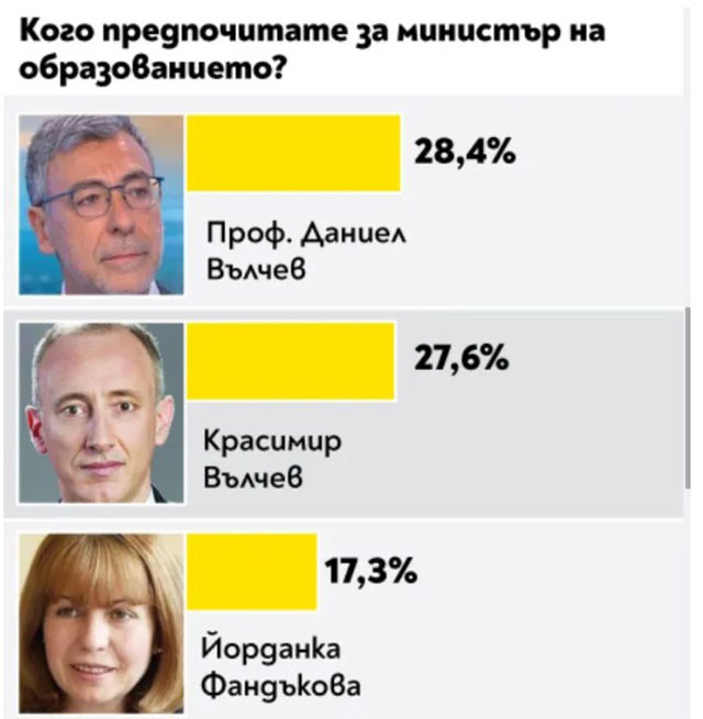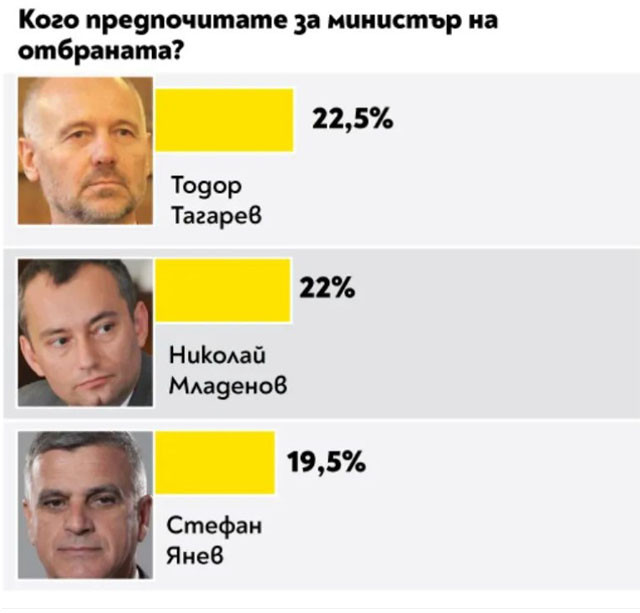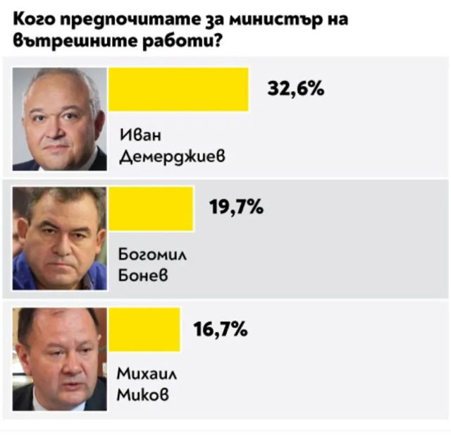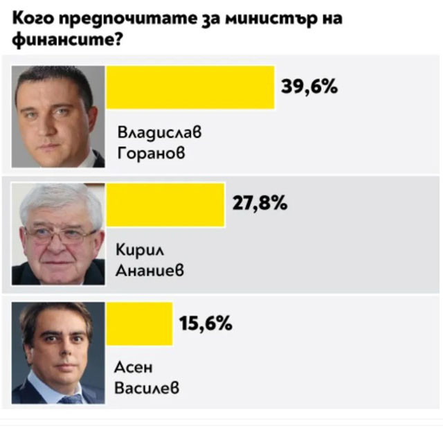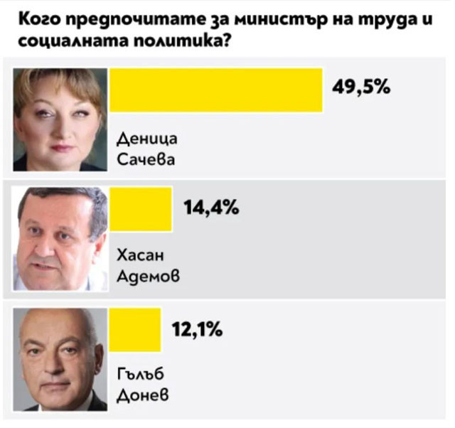 За поста финансов министър най-вече гласове е събрал Владислав Горанов. За това на външните работи - Екатерина Захариева, а на образованието - проф. Даниел Вълчев. Вежди Рашидов пък е най-желаният министър на културата, на опазването на здравето - проф. Костадин Ангелов, като след него се подреждат ген. проф. Венцислав Мутафчийски и проф. Николай Габровски. Деница Сачева е най-желаният министър на обществената политика, а Росен Желязков за превоза. Най-висок % утвърждение за районното министерство печели Николай Нанков, европолитиките се водят от Томислав Дончев.