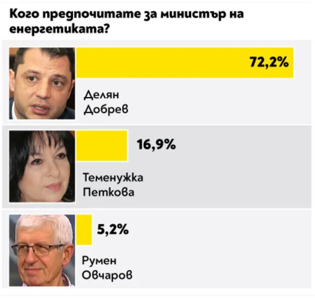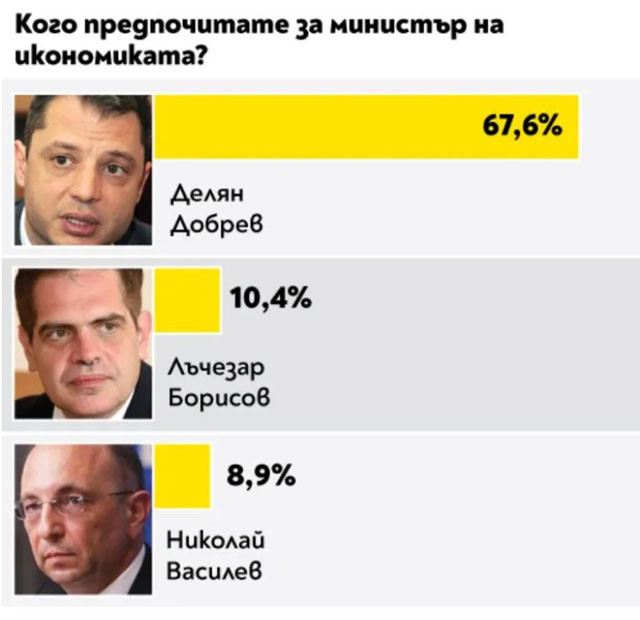 Рекордьор в анкетата е и Делян Добрев, който е номиниран от интервюираните да оглави две министерства, това на стопанската система и на енергетиката, като за второто води със 72.2%.