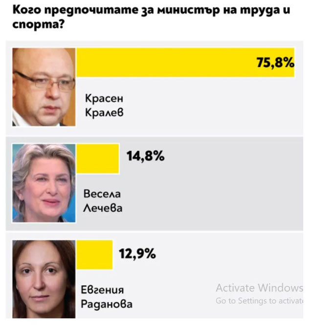 Анкетата демонстрира безусловно утвърждение за поста министър на спорта от Красен Кралев - с внушителните 75,8%, като след него се подреждат Весела Лечева и Евгения Раданова.